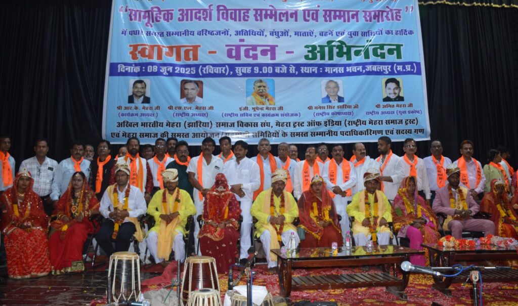 मेहरा समाज के सभी वर्गों झारिया, डेहरिया, मेहर-गढवाल, पठारिया, शाहुपरिया, महोबिया, नुन्हारिया का “अंतर्राष्ट्रीय मेहरा समाज सम्मेलन 2025” का आयोजन दिनांक 08/06/2025 को मानस भवन में सुबह 9 बजे से शाम 6 बजे तक आयोजित किया गया, कार्यक्रम के मुख्य अतिथि माननीय राकेश सिंह मंत्री लोक निर्माण विभाग म. प्र. शासन एवं आर. के. मेहरा कार्यक्रम अध्यक्ष एवं से.नि. प्रमुख अभियंता लोक निर्माण विभाग की अध्यक्षता में सफलतापूर्वक संपन्न हुआ, कार्यक्रम में जगत बहादुर सिंह महापौर एवं निकुंज विज निगम अध्यक्ष सम्मिलित हुए, सम्मेलन में मेहरा समाज के विभिन्न संगठनों के पदाधिकारीगण, सदस्यगण एवं वरिष्ठजन, मातायें, बहनें, युवक-युवतियां और बच्चे परिवार सहित अधिक से अधिक संख्या में विभिन्न प्रदेशों एवं जिलों से सम्मिलित हुए, सम्मेलन में 11 जोड़ों (वर-वधु) का विवाह संपन्न हुआ, कार्यक्रम के अगले चरण में समाज के बुजुर्ग लोगों का सम्मान, साथ ही समाज के प्रतिभावान छात्र-छात्राओं जिन्होंने समाज का नाम गौरवान्वित किया ऐसे बच्चों का सम्मान किया गया, जैसे कि कार्तिक गुप्ता, बारहवीं गणित समूह, 488 अंक, प्रदेश में चौथे सुयांक कांत झारिया को कक्षा दसवीं में 487 अंक प्राप्त हुए हैं, आप नीरज कांत झारिया एवं सविता झारिया के पुत्र हैं, एवम् सुयांक कांत झारिया, 97.4 प्रतिशत शहपुरा निवासी श्रेया पटेल को कक्षा दसवीं में 458 अंक प्राप्त किए, कार्यक्रम का संचालन नेतराम झारिया आभार इंजी. भूपेन्द्र मेहरा, राष्ट्रीय सचिव कार्यक्रम संयोजक द्वारा किया गया।