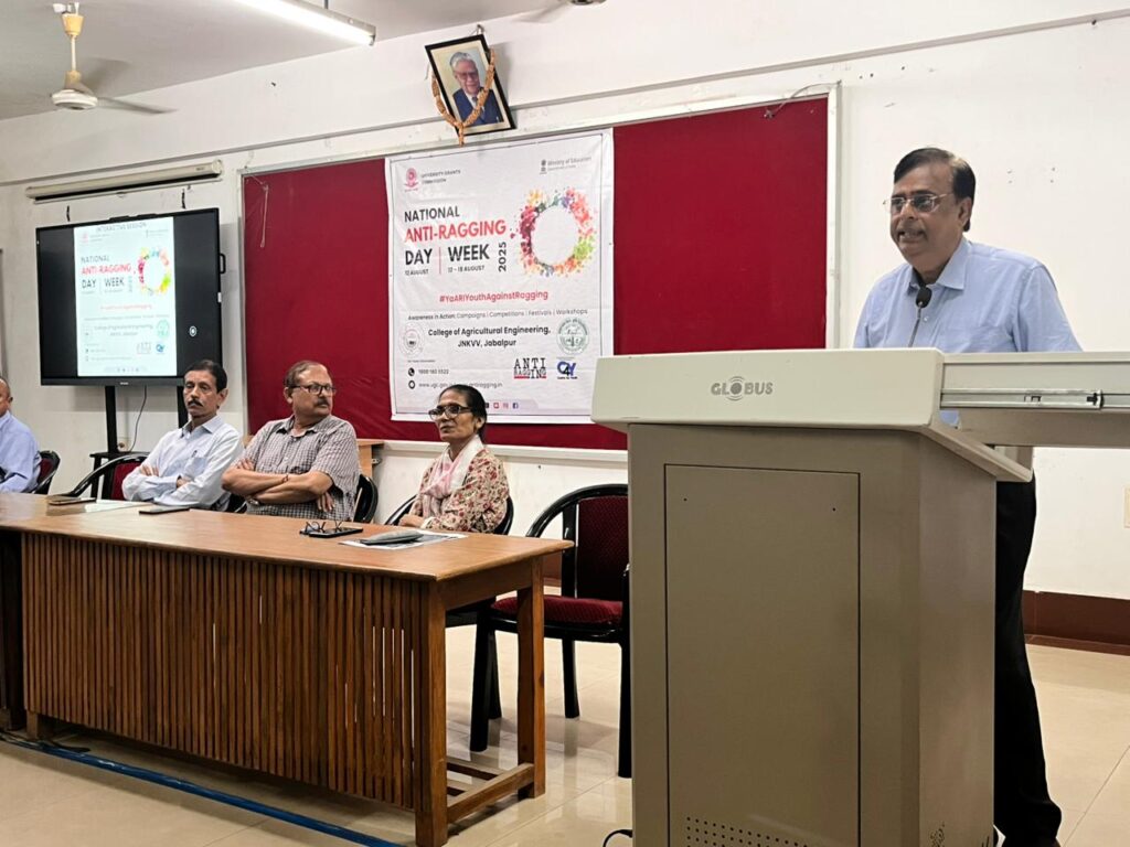 जवाहरलाल नेहरू कृषि विश्वविद्यालय, जबलपुर के कुलपति डॉ. प्रमोद कुमार मिश्रा की प्रेरणा से कृषि अभियांत्रिकी महाविद्यालय के डॉ. एस. वि. आर्या सभागार में एंटी रैगिंग डे का आयोजन अधिष्ठाता कृषि अभियांत्रिकी संकाय डॉ. अतुल श्रीवास्तव के मुख्यआतिथ्य में आयोजित किया गया। इस अवसर पर द्वितीय वर्ष की छात्रा ने उपस्थित छात्रों को रैगिंग से संबंधित नियमों व न्याय संहिता की धाराओं की जानकारी दी। साथ ही रैगिंग जैसी कुप्रथा के खिलाफ छात्रों को जागरुक भी किया गया।इस अवसर पर अधिष्ठाता कृषि अभियांत्रिकी संकाय डॉ. अतुल कुमार श्रीवास्तव ने बच्चों को रैगिंग में शामिल न होने की शपथ दिलाई। गौरतलब है कि यूजीसी और केयर फॉर यू के अंतर्गत 12 अगस्त को एंटी रैगिंग डे व 12-18 अगस्त तक एंटी रैगिंग सप्ताह मनाया जा रहा है। इसके अंतर्गत आने वाले हफ्ते में पोस्टर, नारा, निबंध, रंगोली व अन्य कार्यक्रम एंटी रैगिंग की थीम पर आयोजित होंगे।किया। कार्यक्रम का संचालन डॉ. आर. एन. श्रीवास्तव एवं आभार प्रदर्शन डॉ. मनोज अवस्थी नेइस अवसर पर डॉ. ए.के. राय, डॉ. भारती दास, डॉ. मोहन सिंह, डॉ. आलोक बाजपेयी सहित विभागों के विभागाध्यक्ष, महाविद्यालय के फैकल्टी एवं छात्र-छात्राएं उपस्थित रहे।