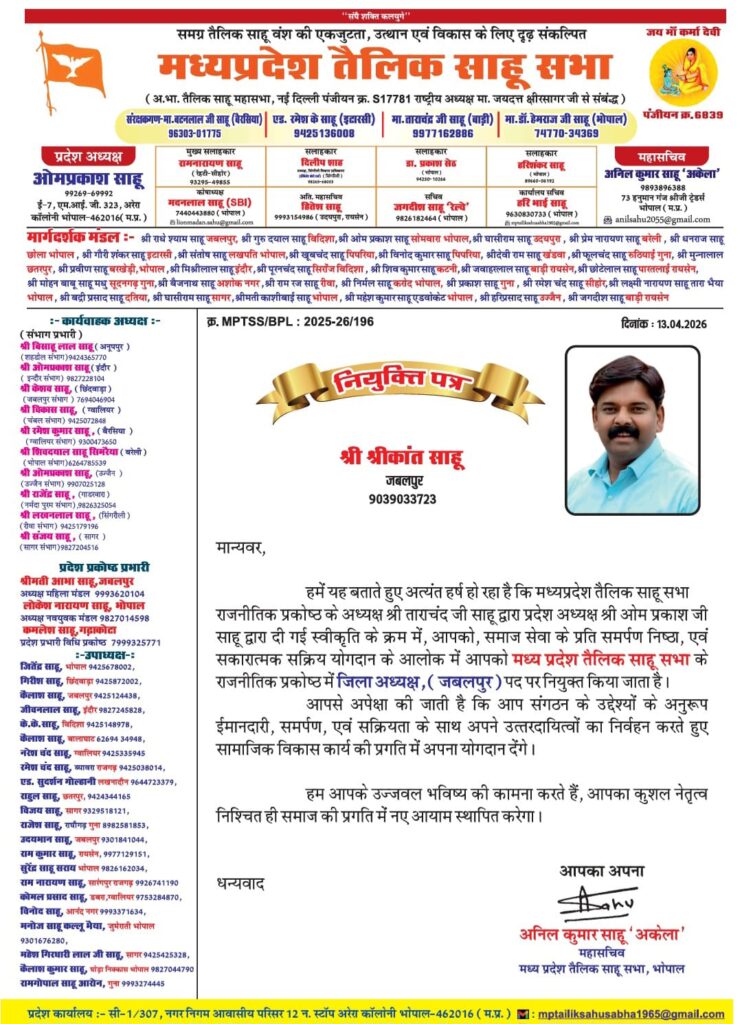 मप्र तैलिक साहू महासभा के प्रदेश अध्यक्ष श्री ओमप्रकाश साहू ‘भोपाल’ की सहमति से राजनैतिक प्रकोष्ठ के प्रदेश अध्यक्ष श्री ताराचंद साहू ‘बाड़ी’ द्वारा श्रीकान्त साहू को मप्र तैलिक साहू महासभा राजनैतिक प्रकोष्ठ जबलपुर का जिला अध्यक्ष नियुक्त किया है।